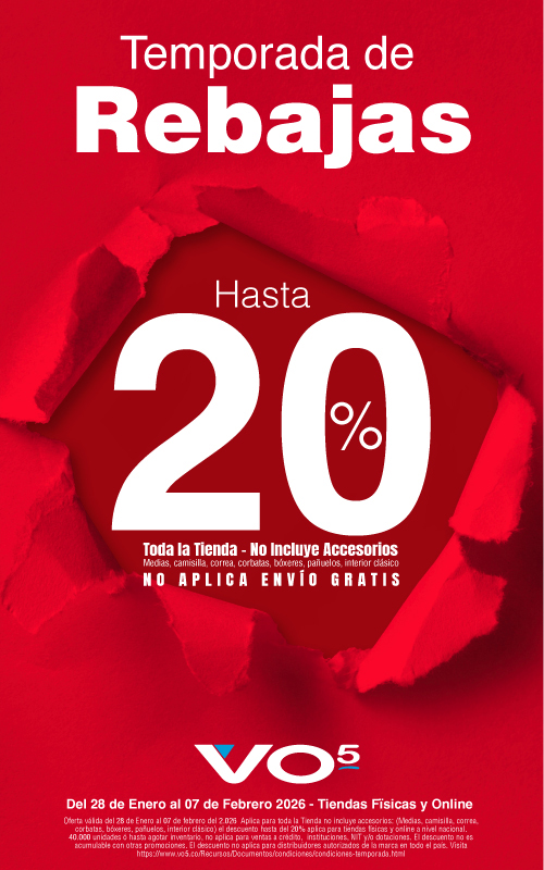 Oferta válida del 28 de enero al 07 de febrero del 2.026. El descuento hasta del 20% aplica para toda la tienda, no incluye accesorios: (Medias, bóxeres, interiores, corbatas, correas, camisillas, pañuelos, pijamas)