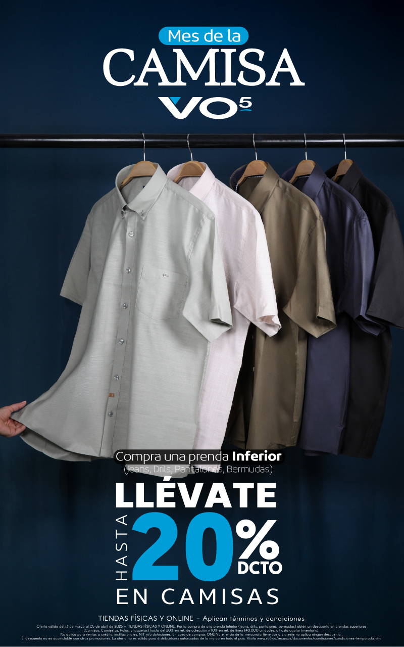 CONDICIONES Y RESTRICCIONESCAMPAÑA MES DE LA CAMISACompra una prenda inferior (Pantalón clásico, dril, jean, bermuda, pantaloneta) LLÉVATE HASTA 20% DE DESCUENTO EN CAMISAS |